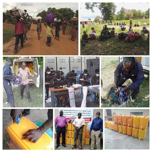 These photos (from upper left) show people displaced by fighting, a new mask factory we are helping with, a project to turn plastic jugs into hand washing/sanitization stations, and pictures of delivering the finished supplies.