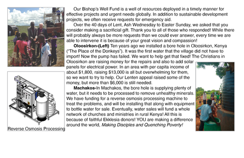 Originally begun to provide clean water to those who did not have access to it, the Bishop’s Well expanded to be a Well of Resources to make positive differences in people’s lives in many areas, not just with water. In addition to water wells and equipment to bottle and sell water, we have pursued projects to build radio stations, process mango juice for sale, and many other projects.