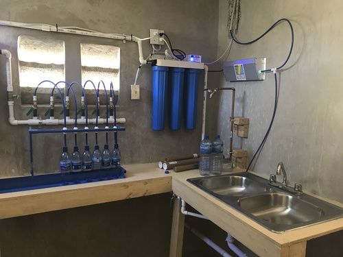 The water purification system includes the equipment to bottle water for sale. The completed system filters water to remove sediment and removes pathogens with ultraviolet purification.