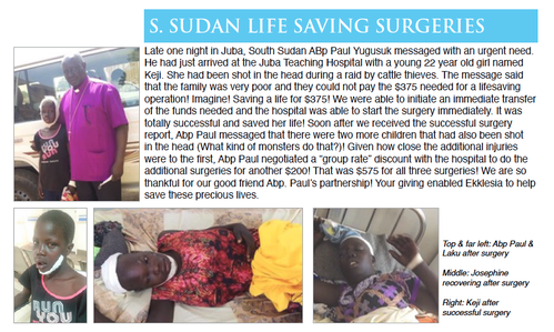 Probably the best thing going in the country is the fast-growing Episcopal Church of South Sudan, boasting eight million members--more than half the population. The Primate, ABp Justin Badi, is a great friend. An even closer relationship is with ABp Paul Yugusuk, son of ABp Benjamin Yugusuk, former Archbishop of Sudan. ABp Benjamin was also a wonderful spiritual father to me for many years from 1993 until his death in 2000. ABp Paul and I are brothers, and collaborate all the time. Your generosity just allowed us to send money to help with COVID-19 relief and prevention.